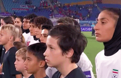 从直播画面可以看到,伊朗女足球员戴着头巾参赛。在国歌播放时,伊朗女足全体队员保持沉默,没有跟随国歌的伴奏,演唱伊朗国歌。